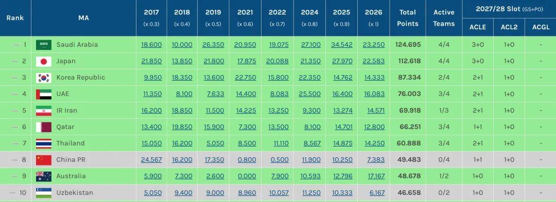 墨尔本城被武里南联淘汰、无缘亚冠精英联赛八强,澳超球队本赛季亚冠全军覆没,其亚足联技术积分仍落后中超0.3分。这意味着2027-28赛季中超将继续保有3个亚冠席位,即1个亚冠精英联赛正赛名额、1个亚冠精英联赛附加赛名额、1个亚冠二级联赛正赛名额。